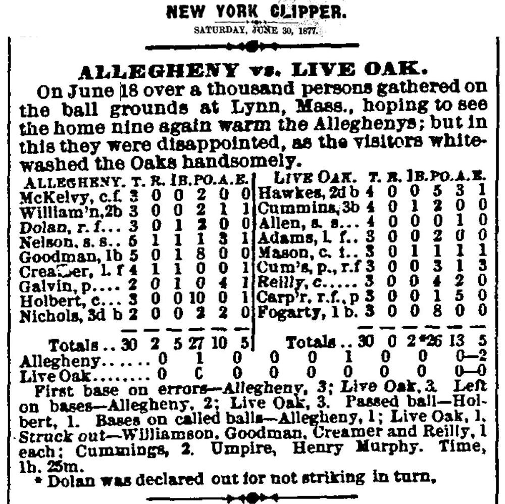 | 2b | Thorny Hawkes | | 3b | Andy Cummins | | ss | Jack Allen | | lf | George Adams | | cf | Charlie Mason | | rf & p | Candy Cummings | | c | Charlie Reilley | | p & rf | Albert Carpenter | | 1b | M J Fogarty | | | Allegheny