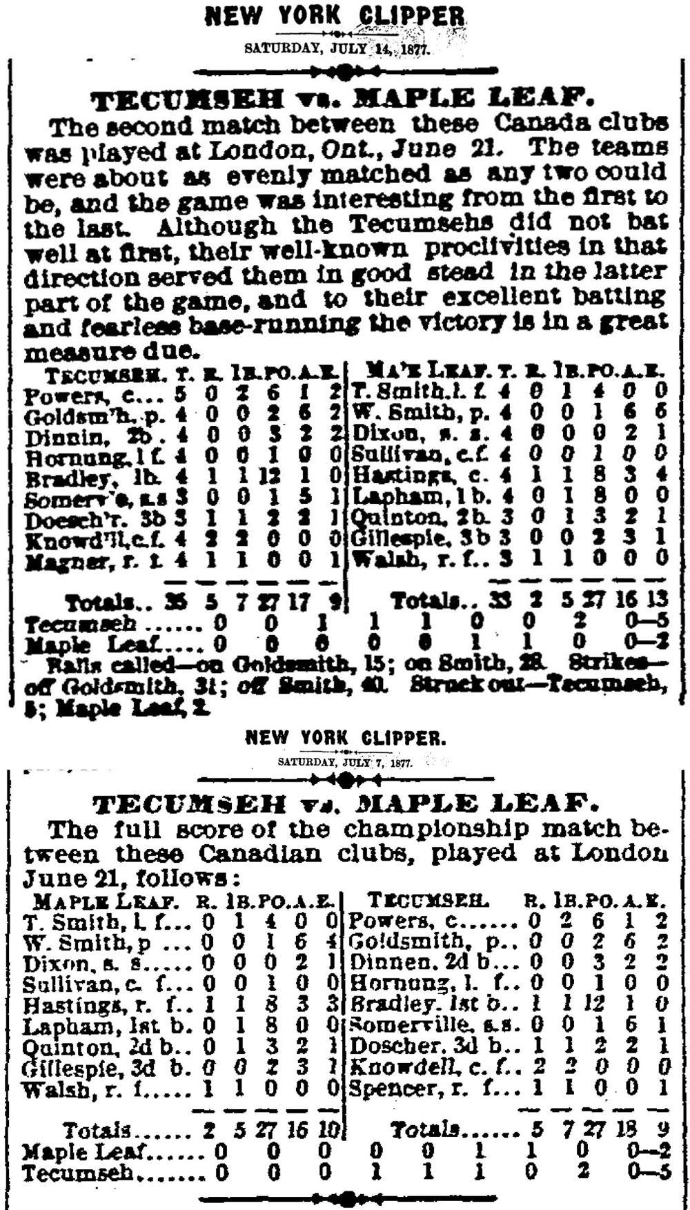 | c | Phil Powers | | p | Fred Goldsmith | | 2b | Mike Dinnen | | lf | Joe Hornung | | 1b | Foghorn Bradley | | ss | Ed Somerville | | 3b | Herm Doscher | | cf | Jake Knodell | | rf | John Magner | | | Maple Leaf
