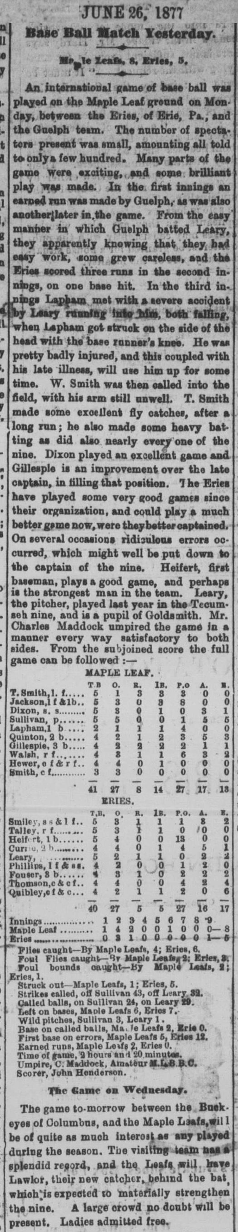 June 25, 1877 at GuelphMaple Leaf 8, Erie 5GameID g06251877-02 "Lapham, of the Guelphs, was injured in the fifth inning and had to be carried home in a cab." (New York Mercury, July 14, 1877, pg. 8)