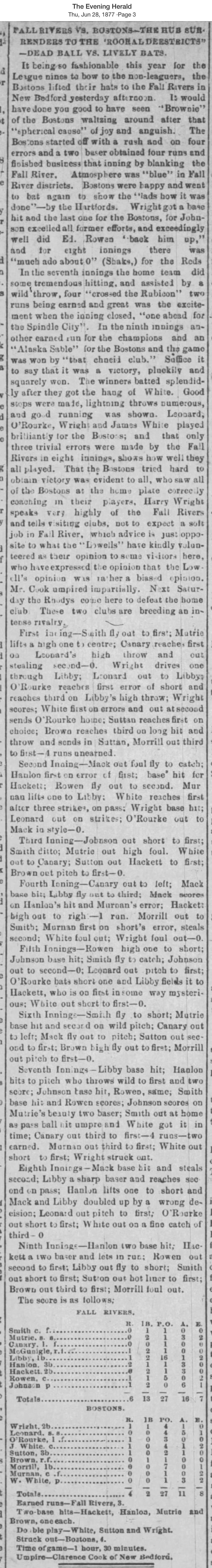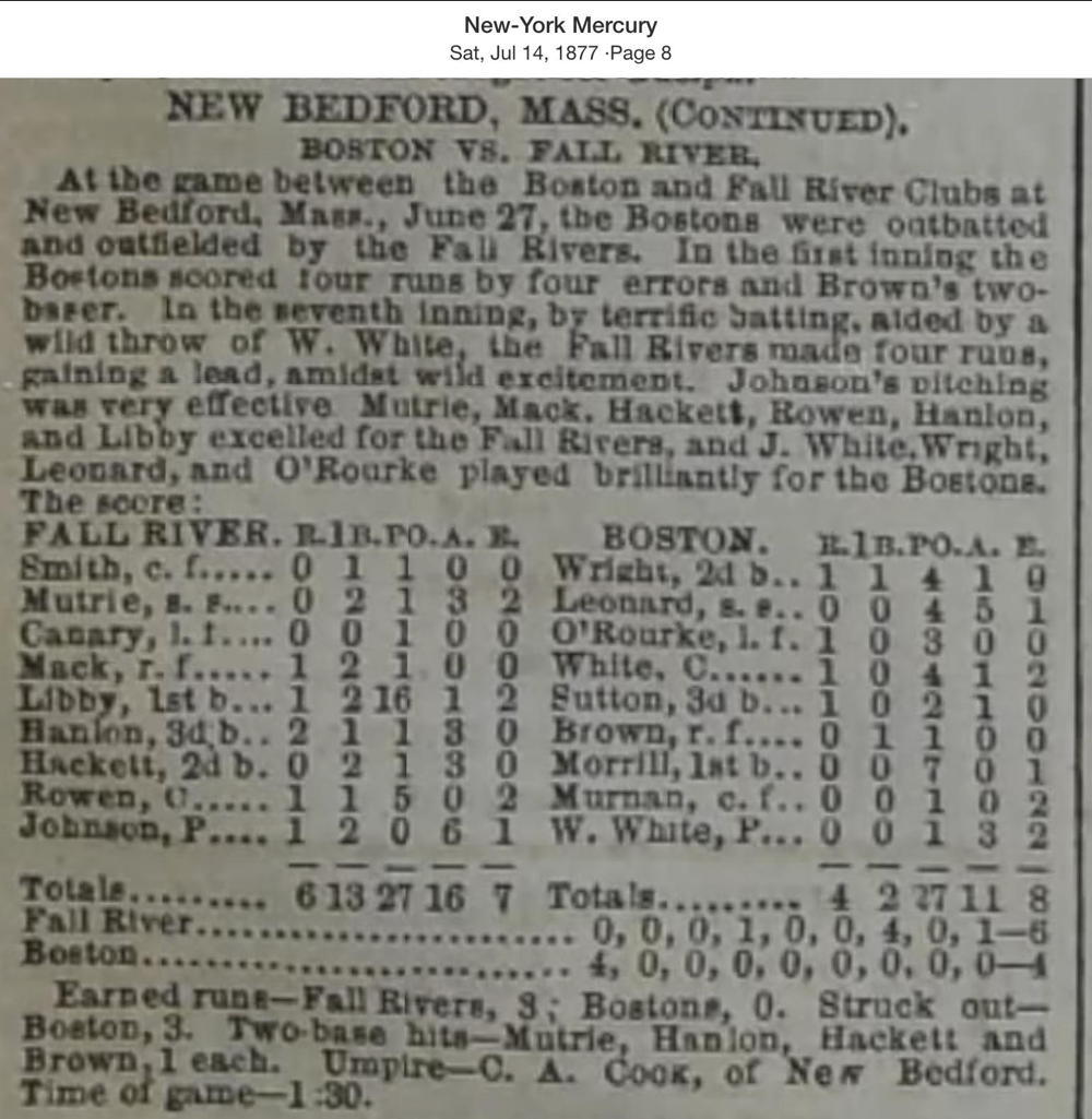 June 27, 1877 at New BedfordFall River 6, Boston 4GameID g06271877-01