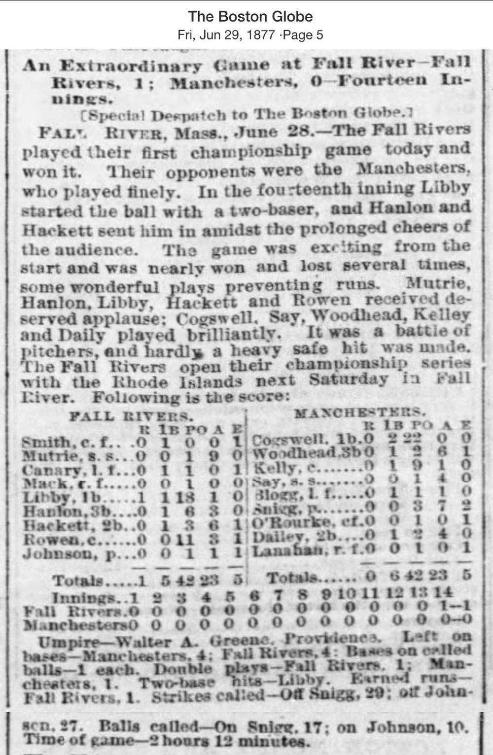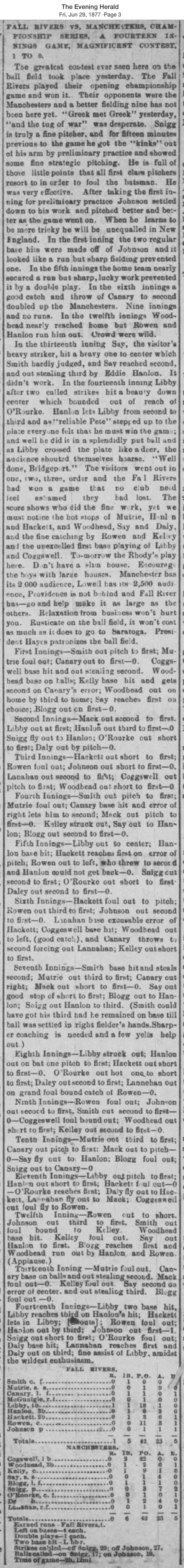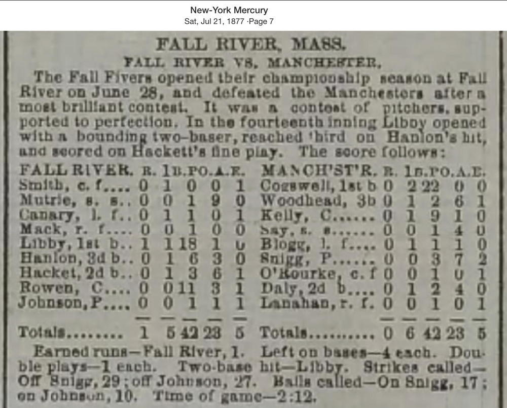 June 28, 1877 at Fall RiverFall River 1, Manchester 0GameID g06281877-01 14 innings