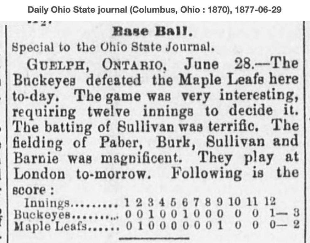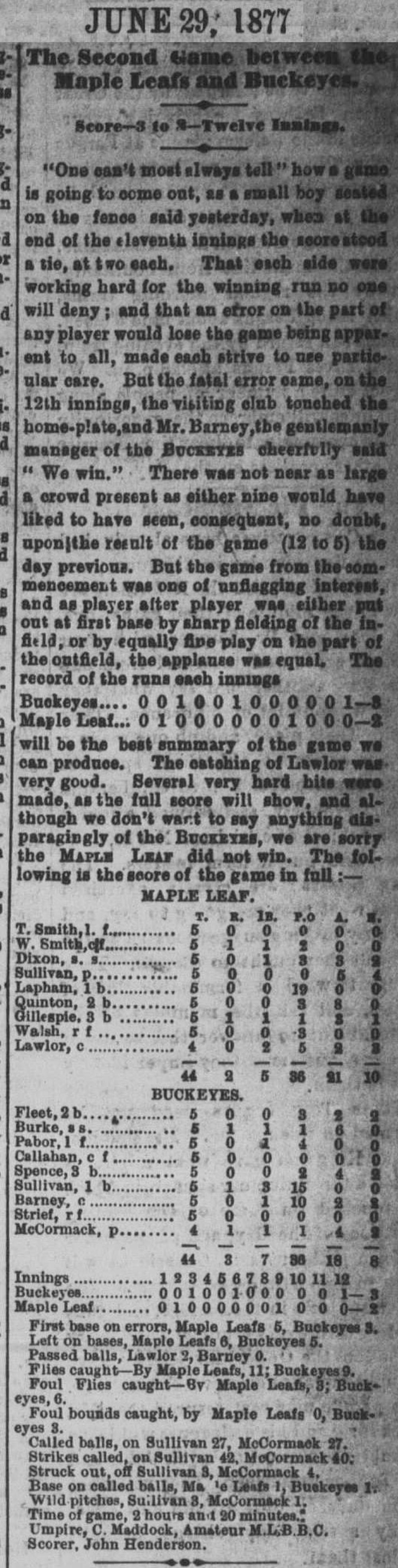 June 28, 1877 at GuelphMaple Leaf 2, Buckeyes 3GameID g06281877-03 12 innings