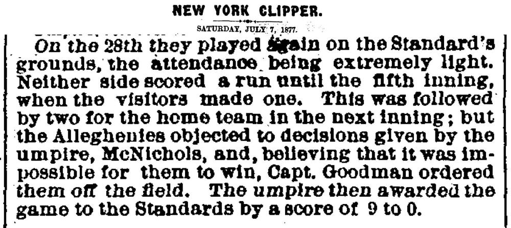 June 28, 1877 at WheelingWheeling Standard 2, Allegheny 1GameID g06281877-04 Forfeit win for Wheeling at 6 innings