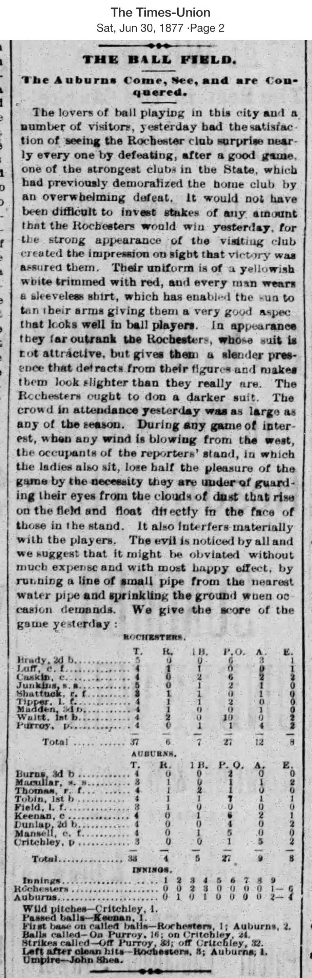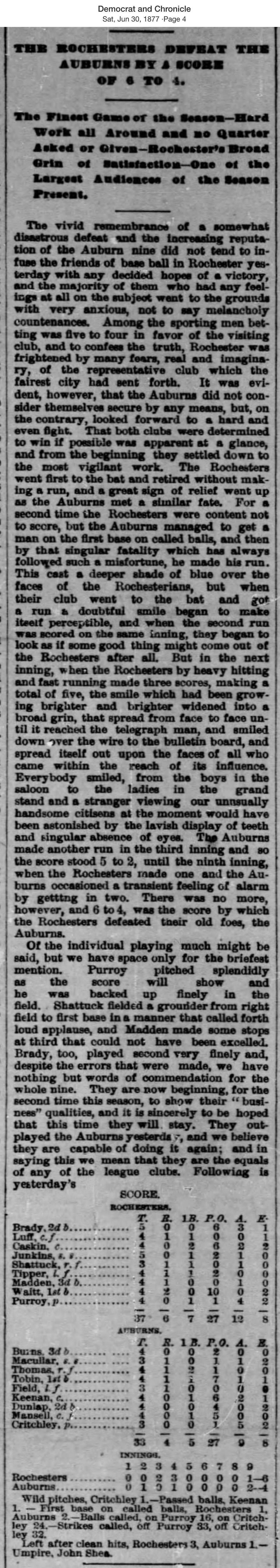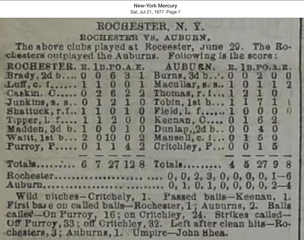 June 29, 1877 at RochesterRochester 6, Auburn 4GameID g06291877-03
