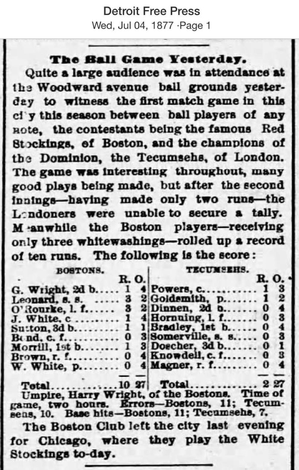 July 3, 1877 at DetroitBoston 10, Tecumseh 2GameID g07031877-01