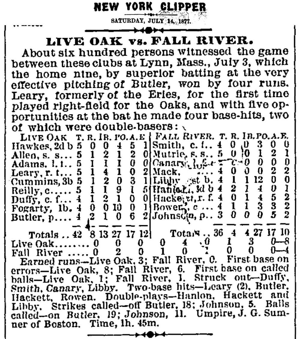 | 2b | Thorny Hawkes | | ss | Jack Allen | | lf | George Adams | | rf | Jack Leary | | 3b | Andy Cummins | | c | Charlie Reilley | | cf | John Duffy | | 1b | M J Fogarty | | p | Joseph Butler | | | Fall River
