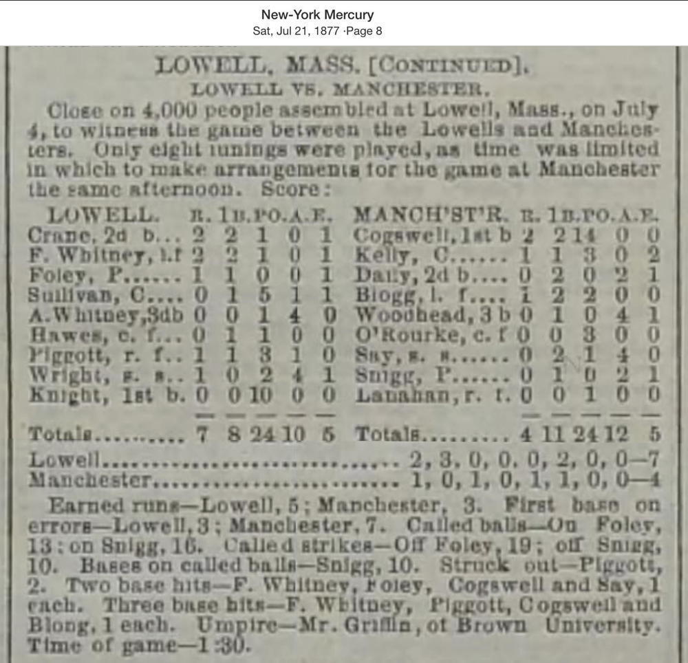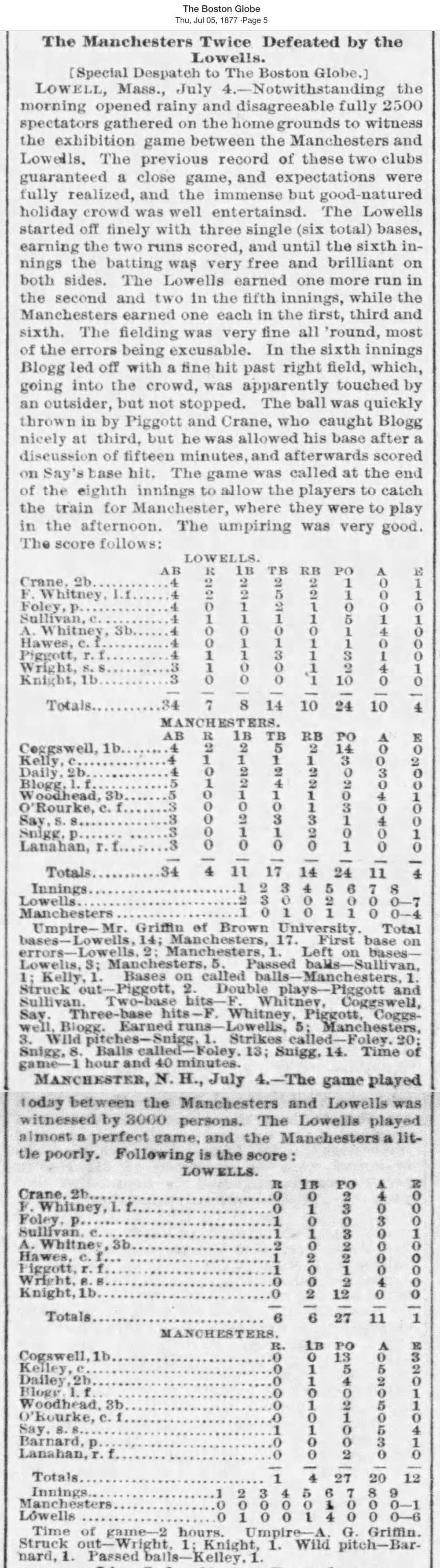 July 4, 1877 at LowellLowell 7, Manchester 4GameID g07041877-07 Game 1