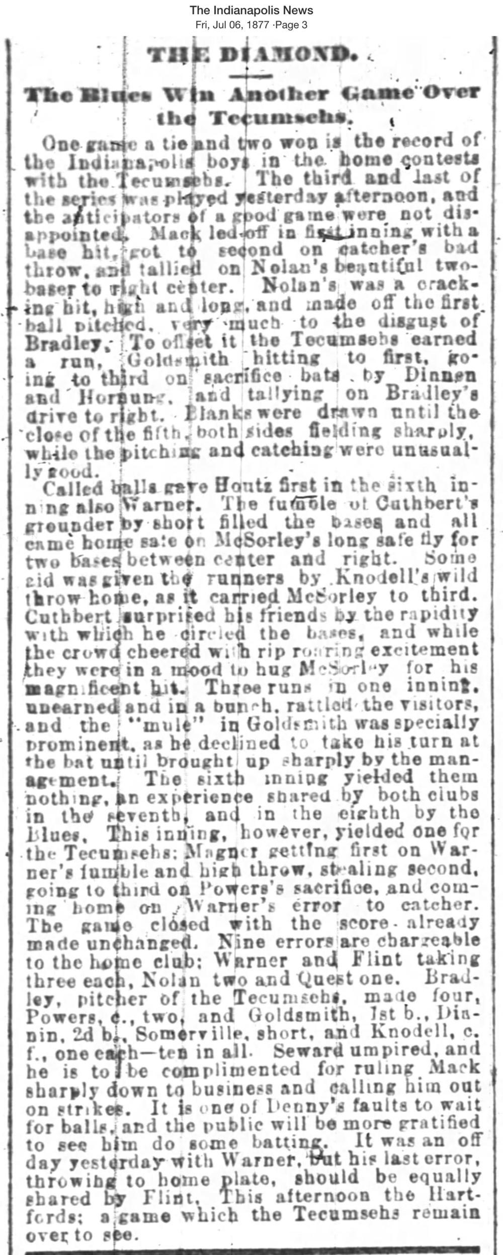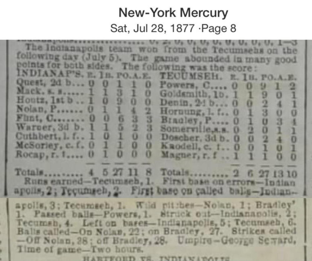 July 5, 1877 at IndianapolisIndianapolis 4, Tecumseh 2GameID g07051877-02