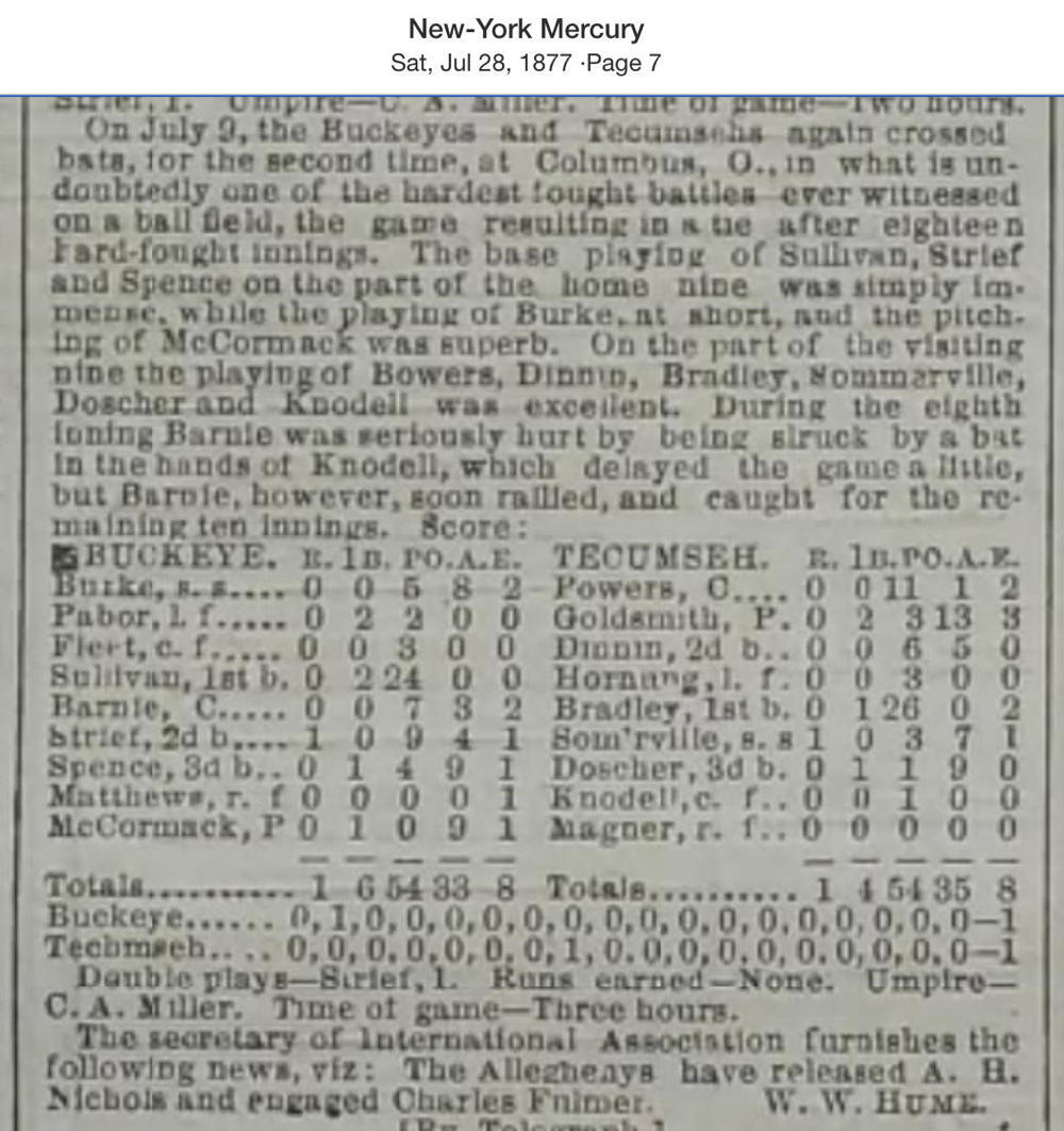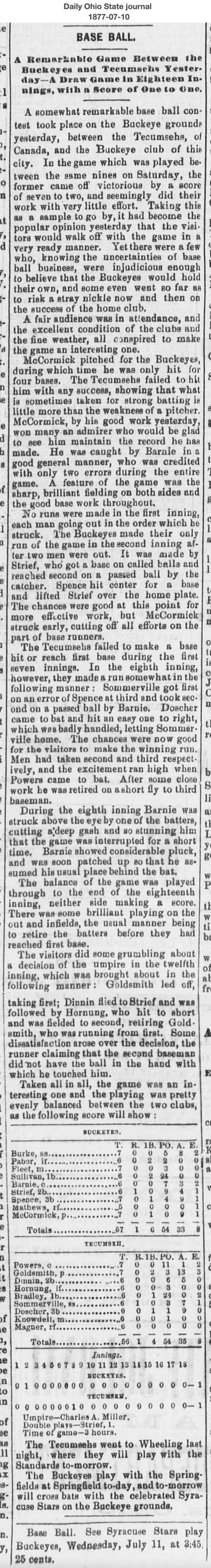 July 9, 1877 at ColumbusBuckeyes 1, Tecumseh 1GameID g07091877-02 18 innings