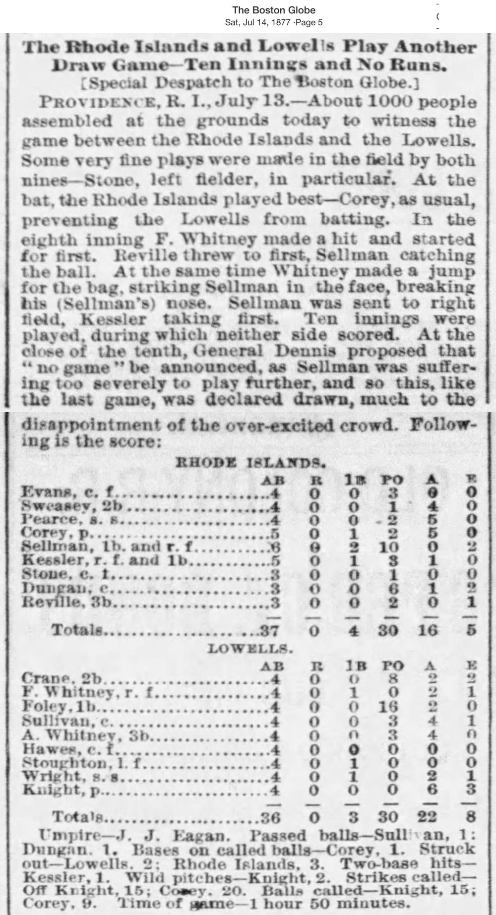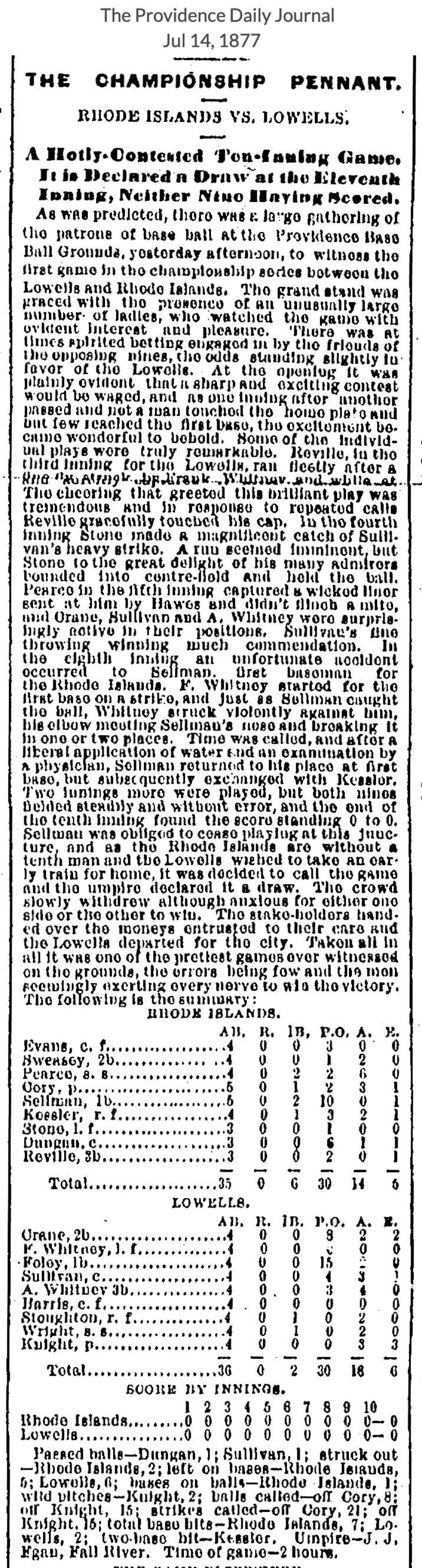 July 13, 1877 at ProvidenceRhode Island 0, Lowell 0GameID g07131877-06 10 innings