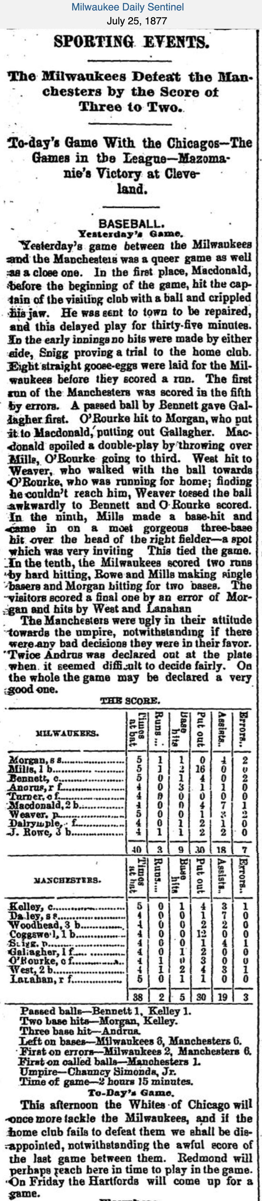 July 24, 1877 at MilwaukeeMilwaukee 3, Manchester 2GameID g07241877-04 10 innings