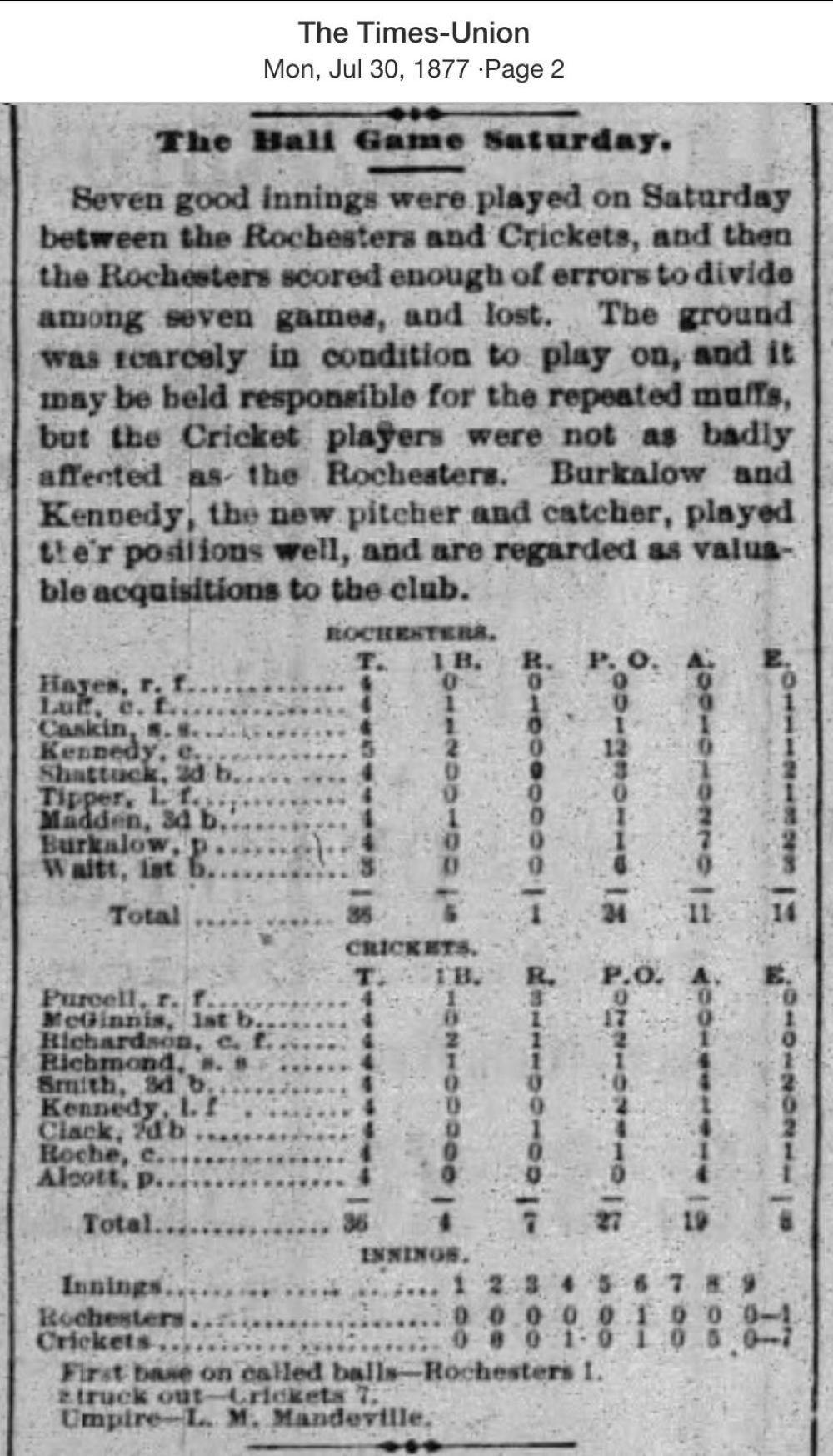 July 28, 1877 at RochesterRochester 1, Crickets 7GameID g07281877-03