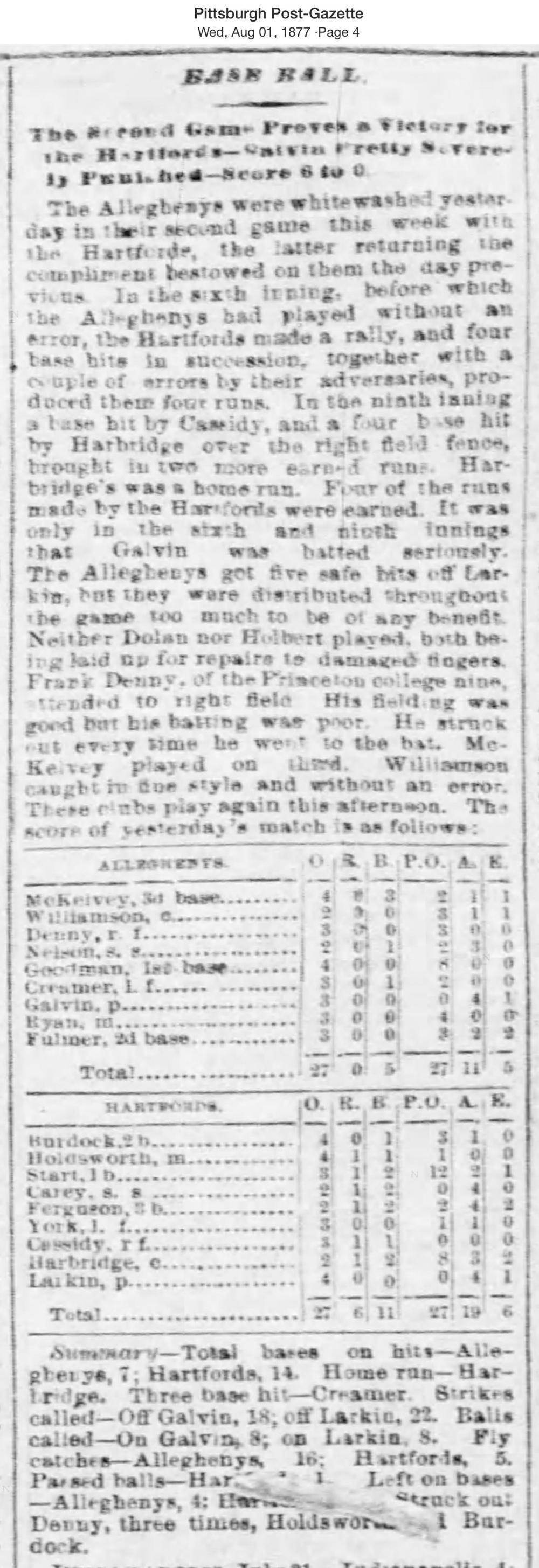 July 31, 1877 at AlleghenyAllegheny 0, Hartford 6GameID g07311877-01