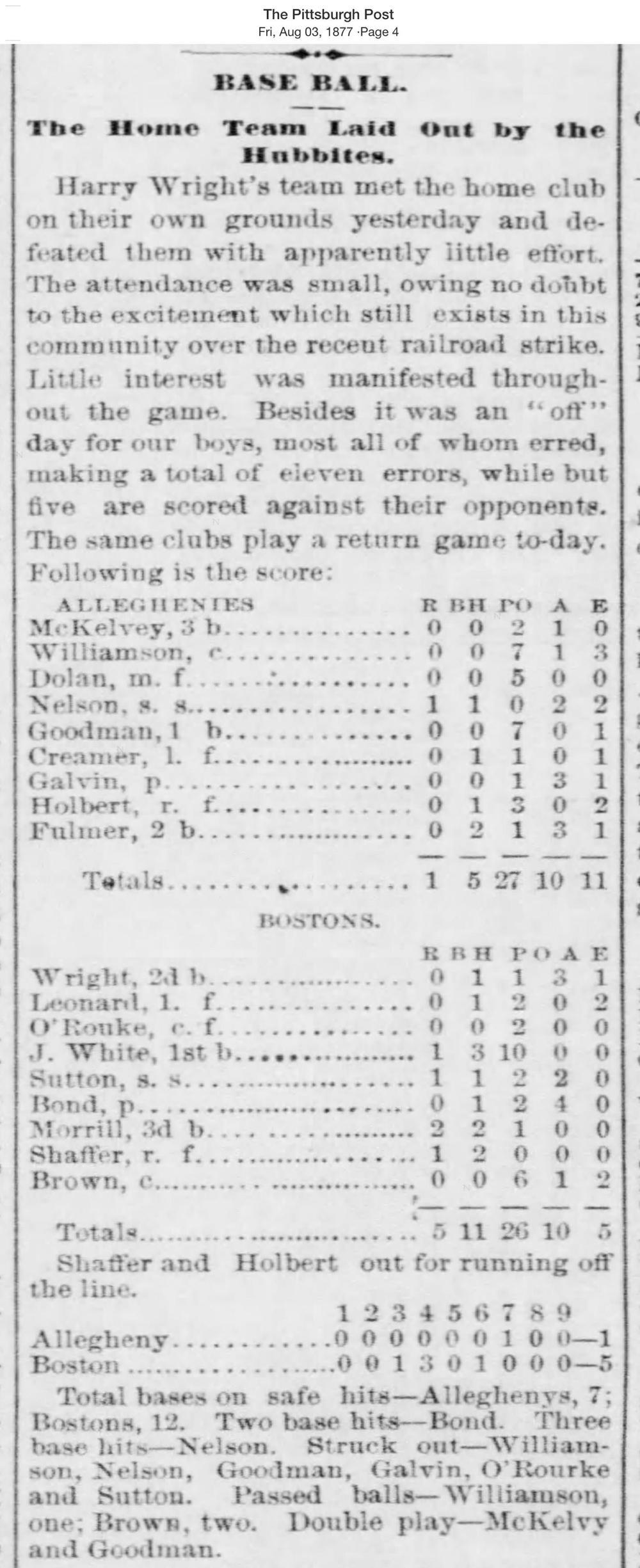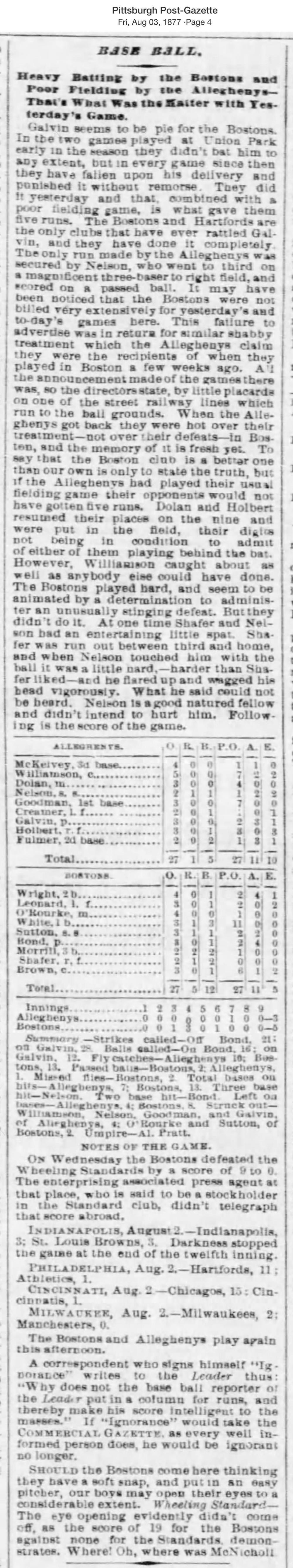 August 2, 1877 at AlleghenyAllegheny 1, Boston 5GameID g08021877-01