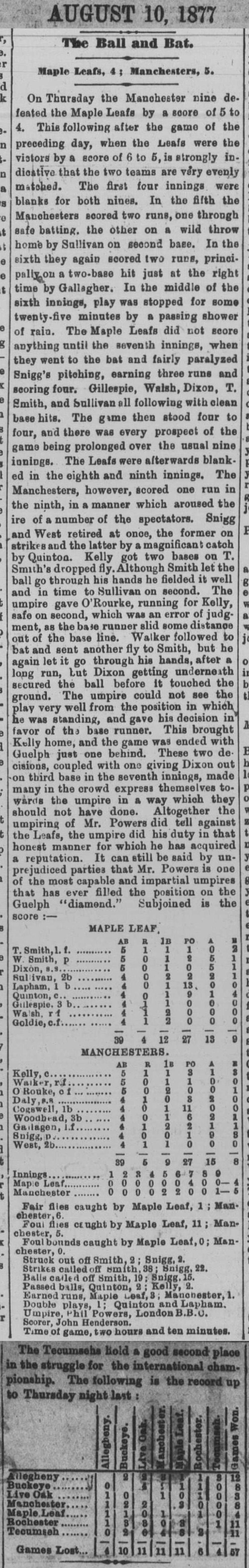 August 9, 1877 at GuelphMaple Leaf 4, Manchester 5GameID g08091877-02