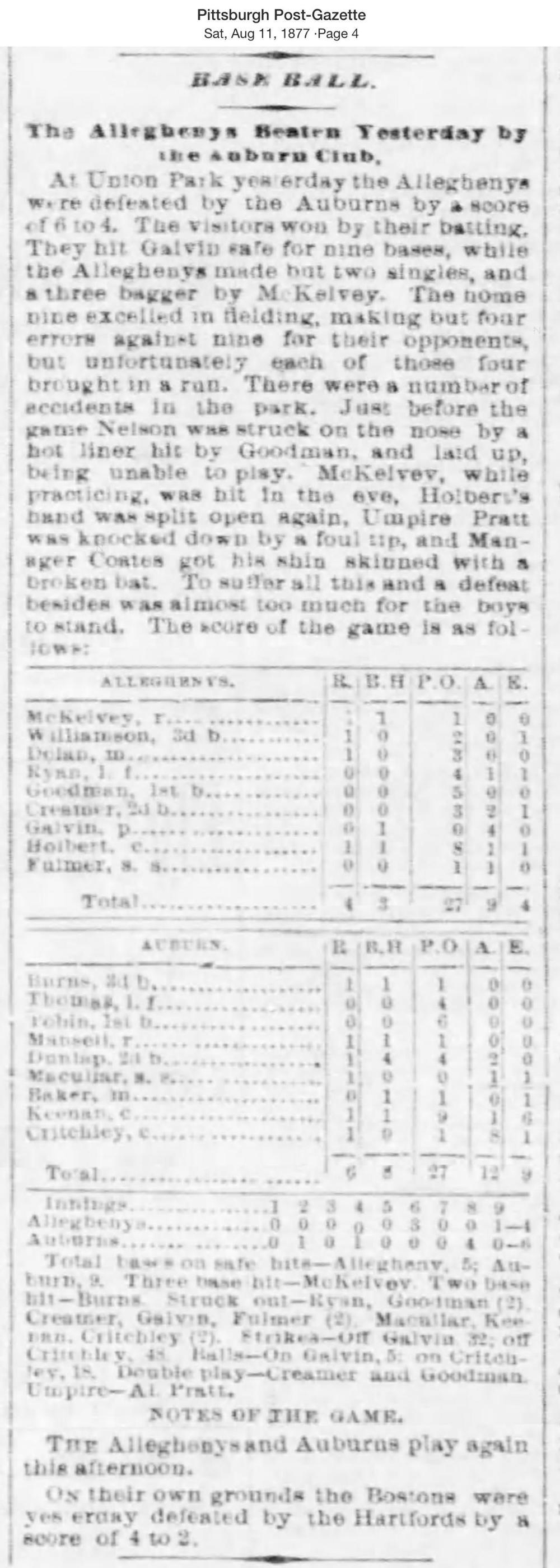 August 10, 1877 at AlleghenyAllegheny 4, Auburn 6GameID g08101877-01