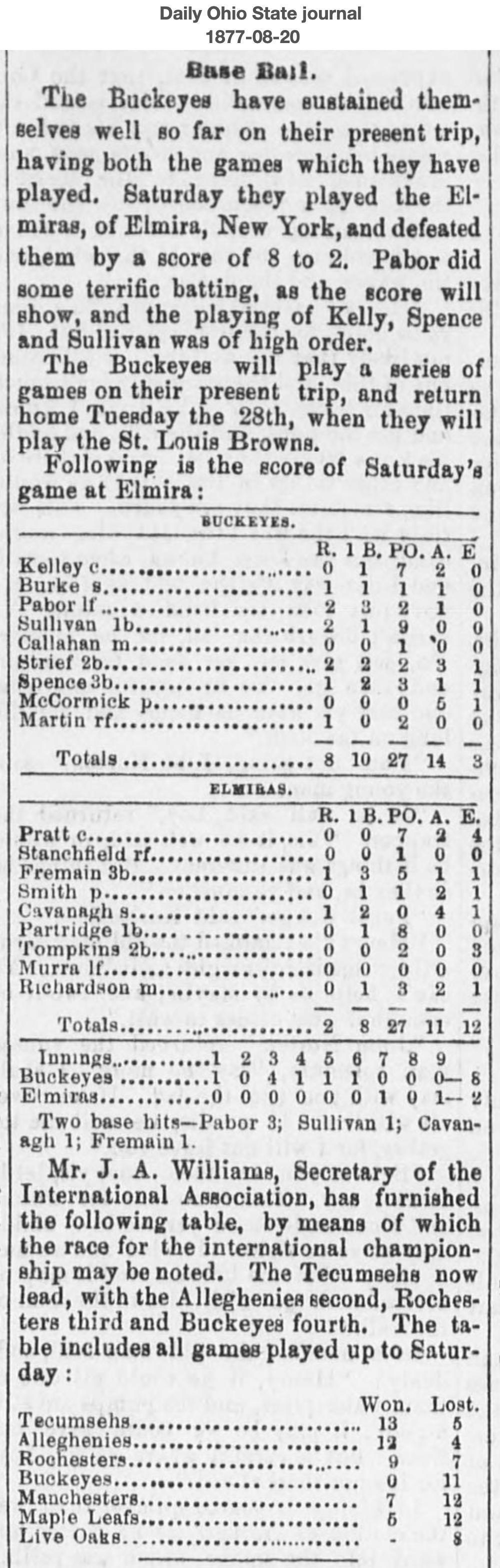 August 18, 1877 at ElmiraElmira 2, Buckeyes 8GameID g08181877-01