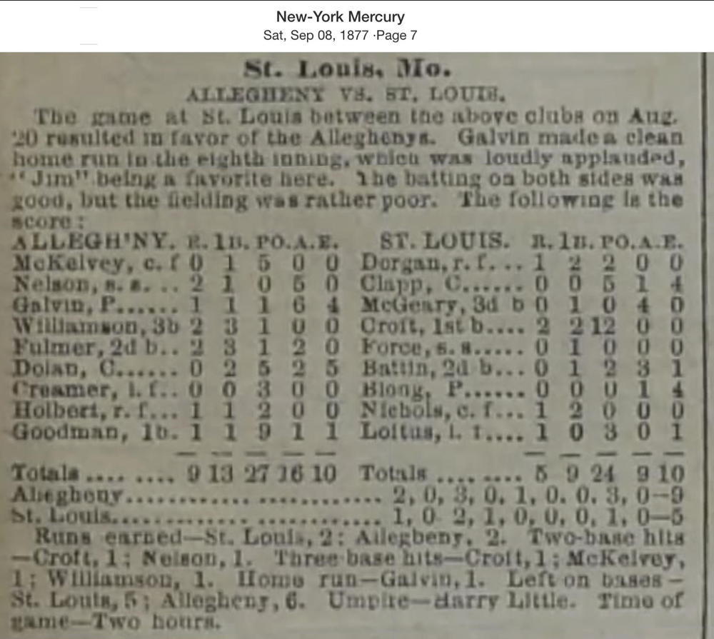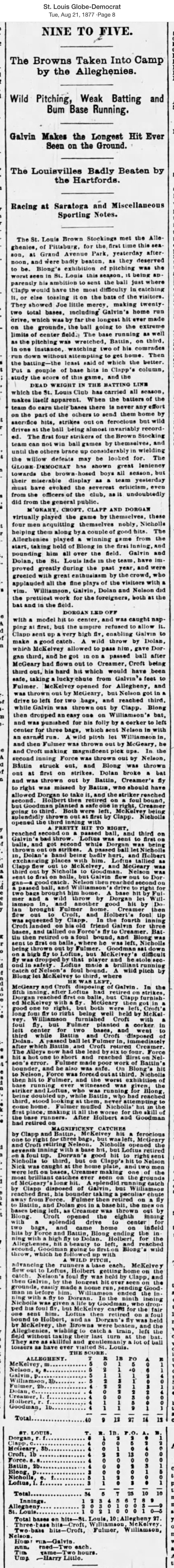 August 20, 1877 at St. LouisSt. Louis 5, Allegheny 9GameID g08201877-05