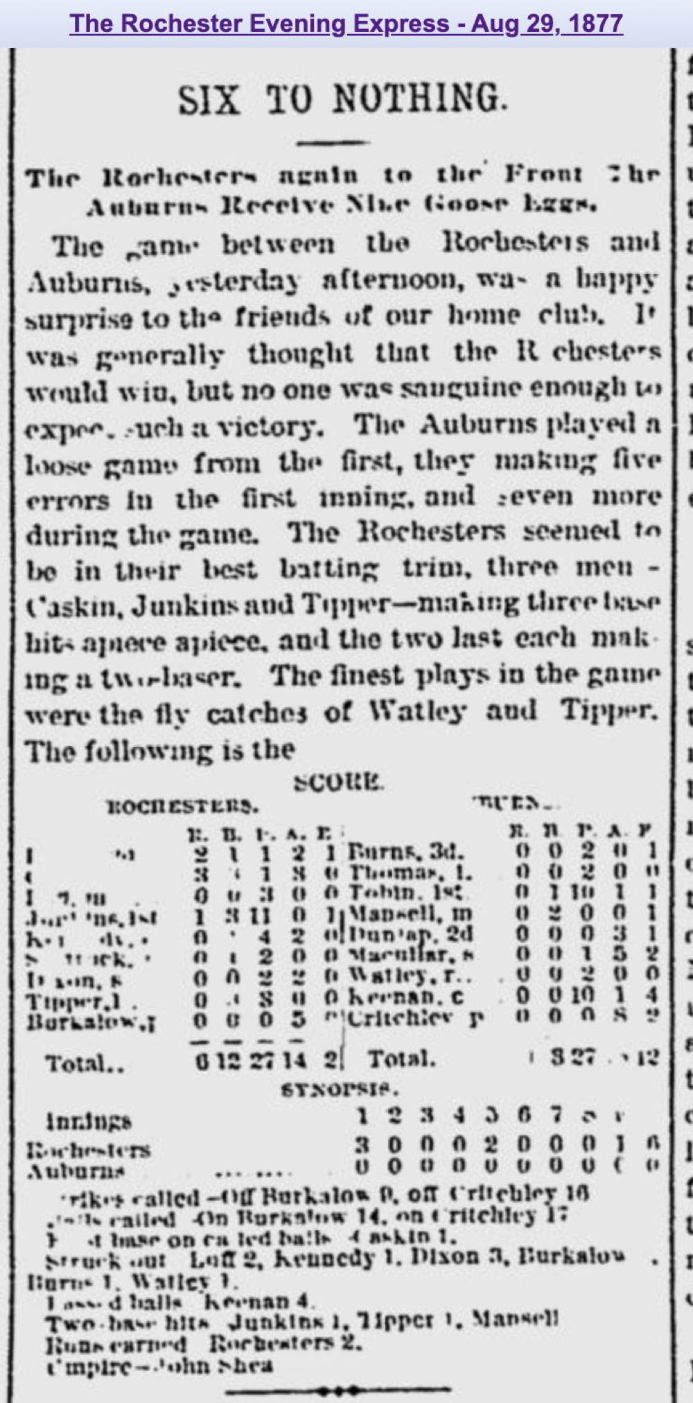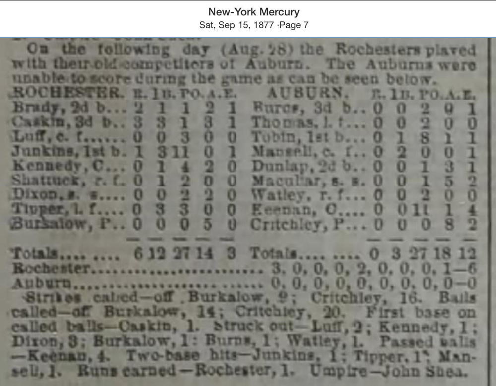 August 28, 1877 at RochesterRochester 6, Auburn 0GameID g08281877-06
