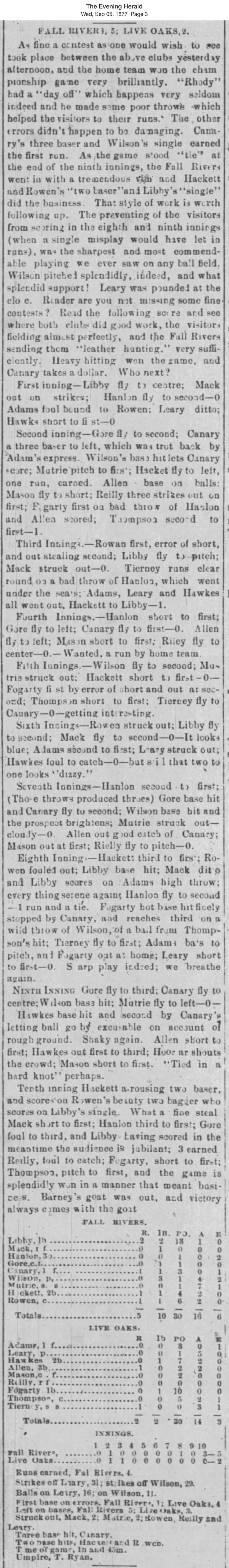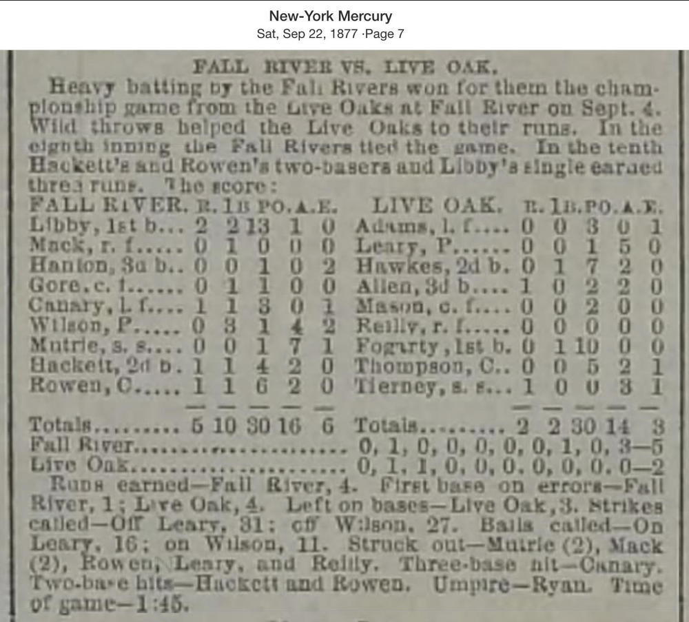 September 4, 1877 at Fall RiverFall River 5, Live Oak 2GameID g09041877-02 10 innings