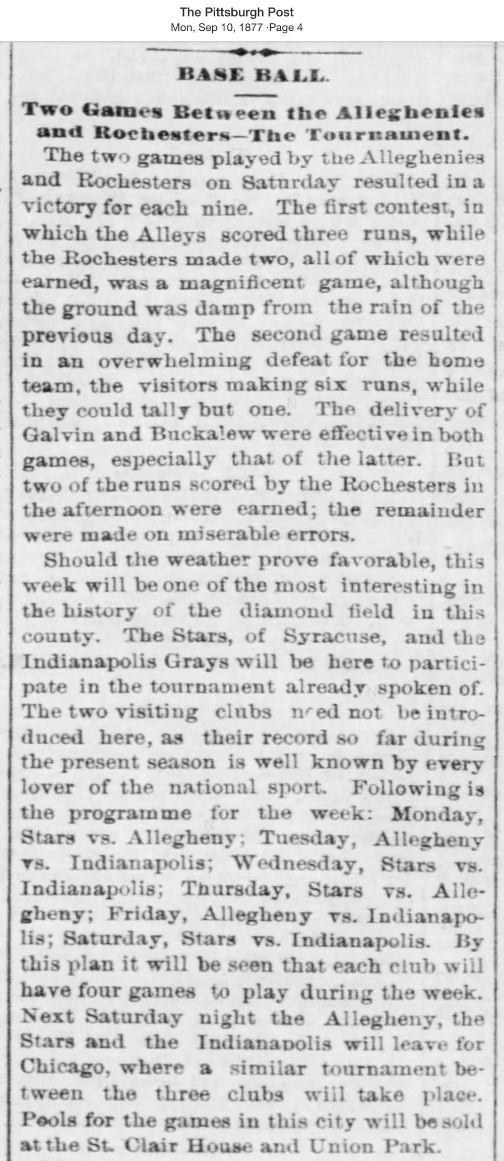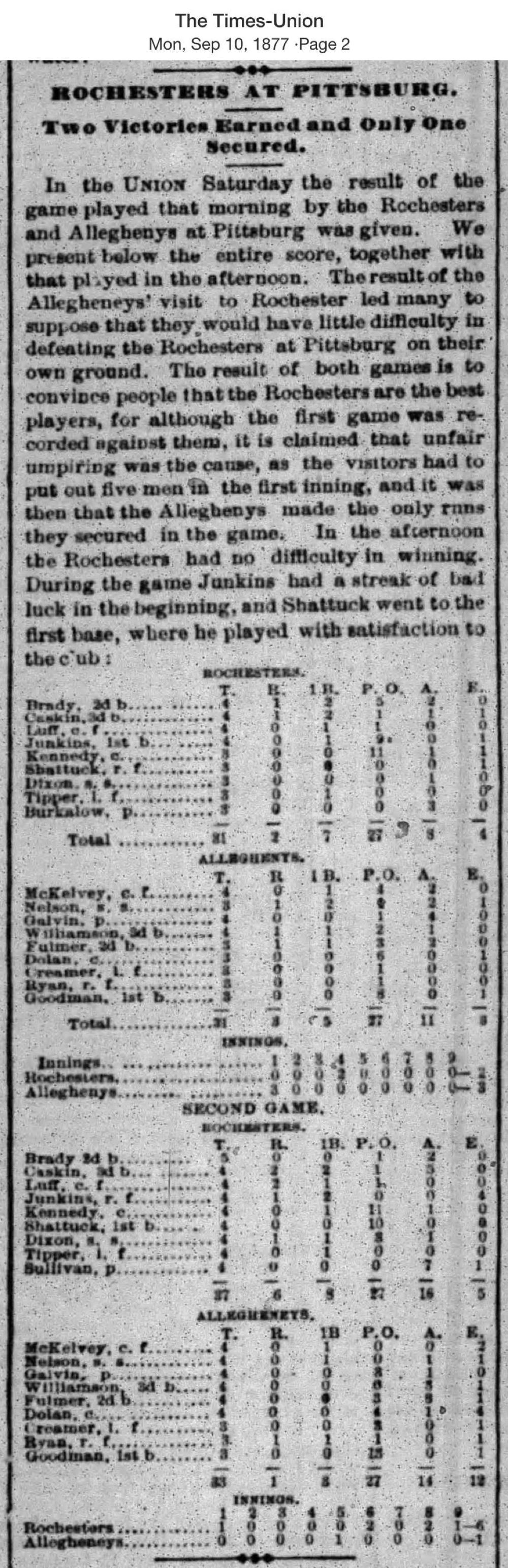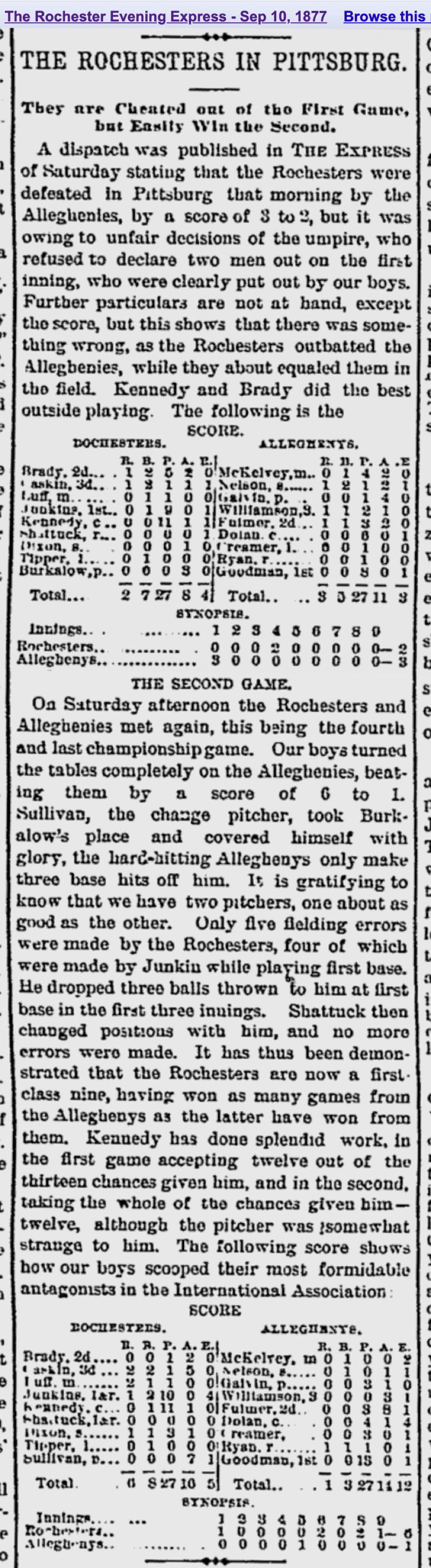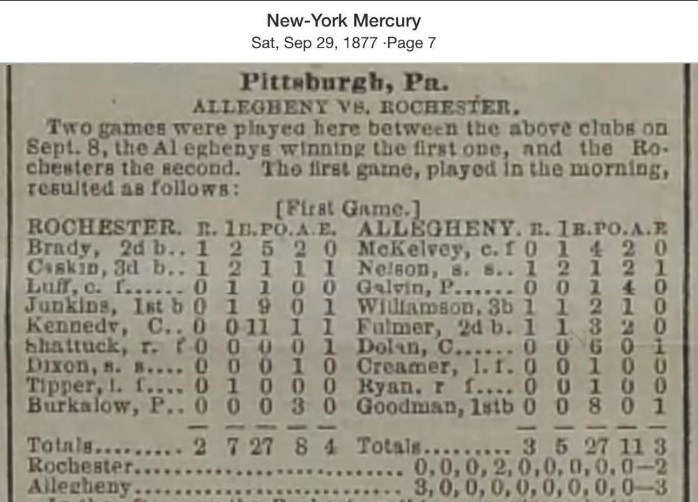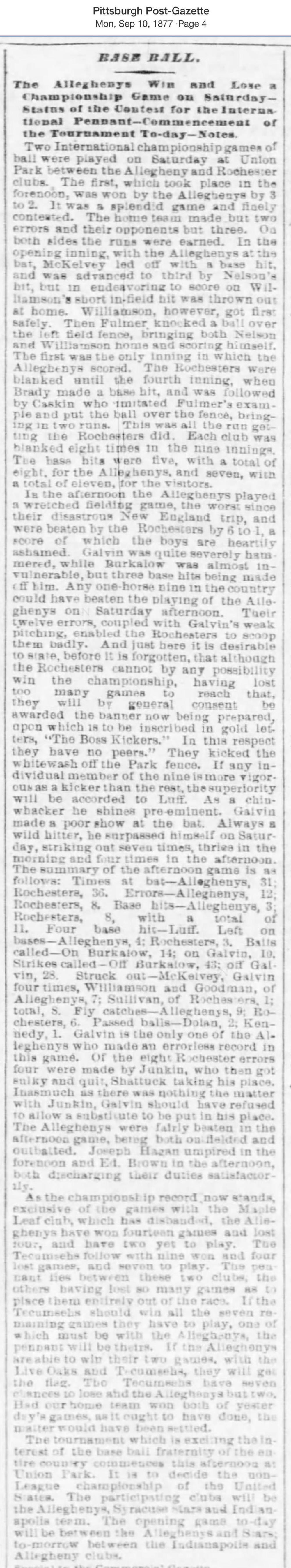 September 8, 1877 at AlleghenyAllegheny 3, Rochester 2GameID g09081877-01 Game 1