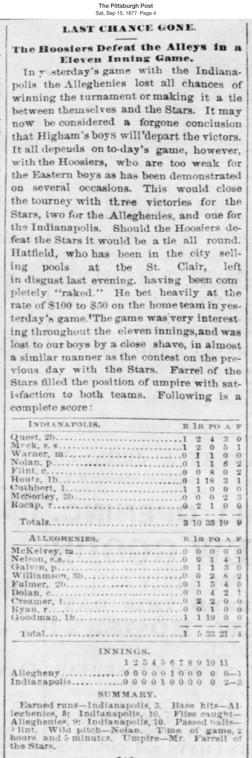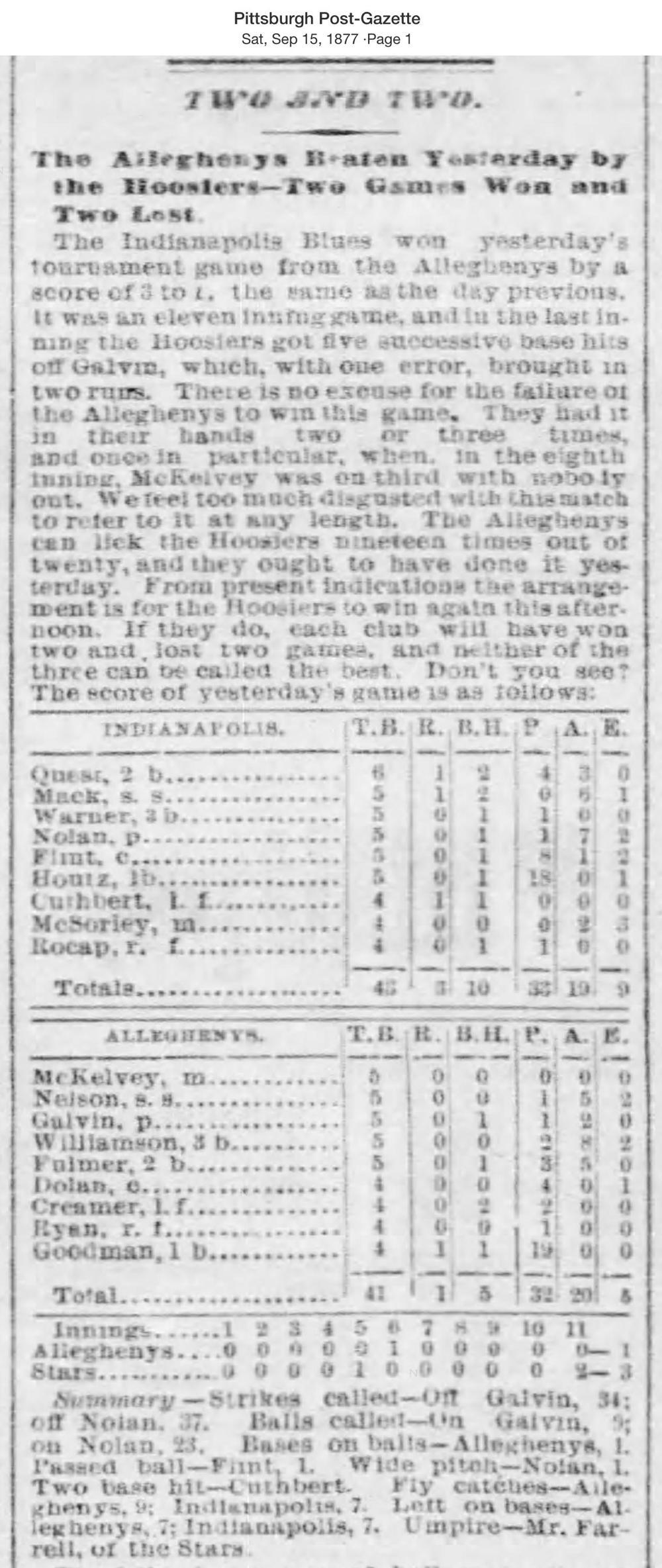 September 14, 1877 at AlleghenyAllegheny 1, Indianapolis 3GameID g09141877-01