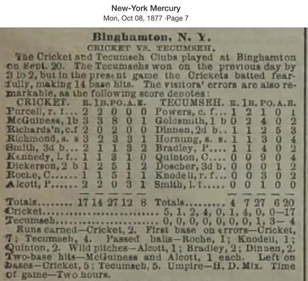 September 20, 1877 at BinghamptonCrickets 17, Tecumseh 4GameID g09201877-03