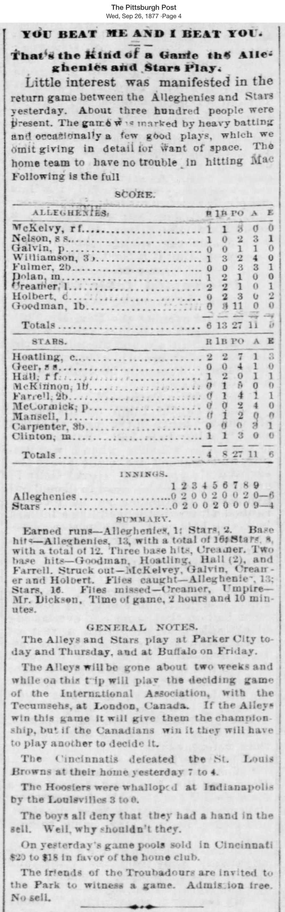 September 25, 1877 at AlleghenyAllegheny 6, Syracuse Stars 4GameID g09251877-01