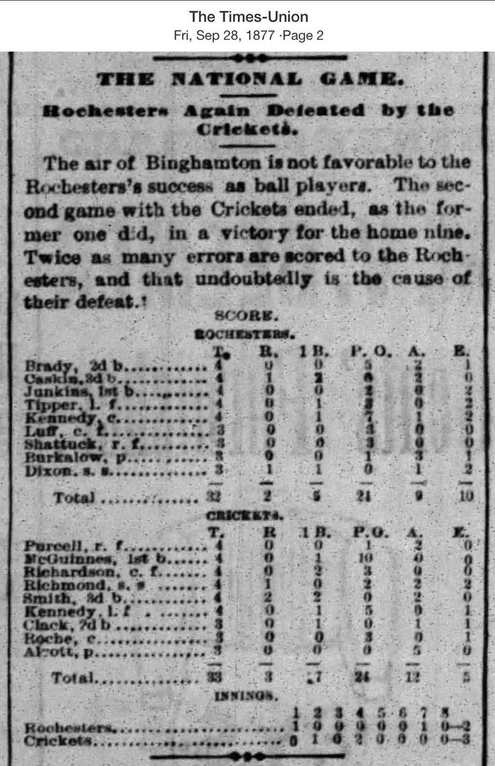 September 27, 1877 at BinghamtonCrickets 3, Rochester 2GameID g09271877-02