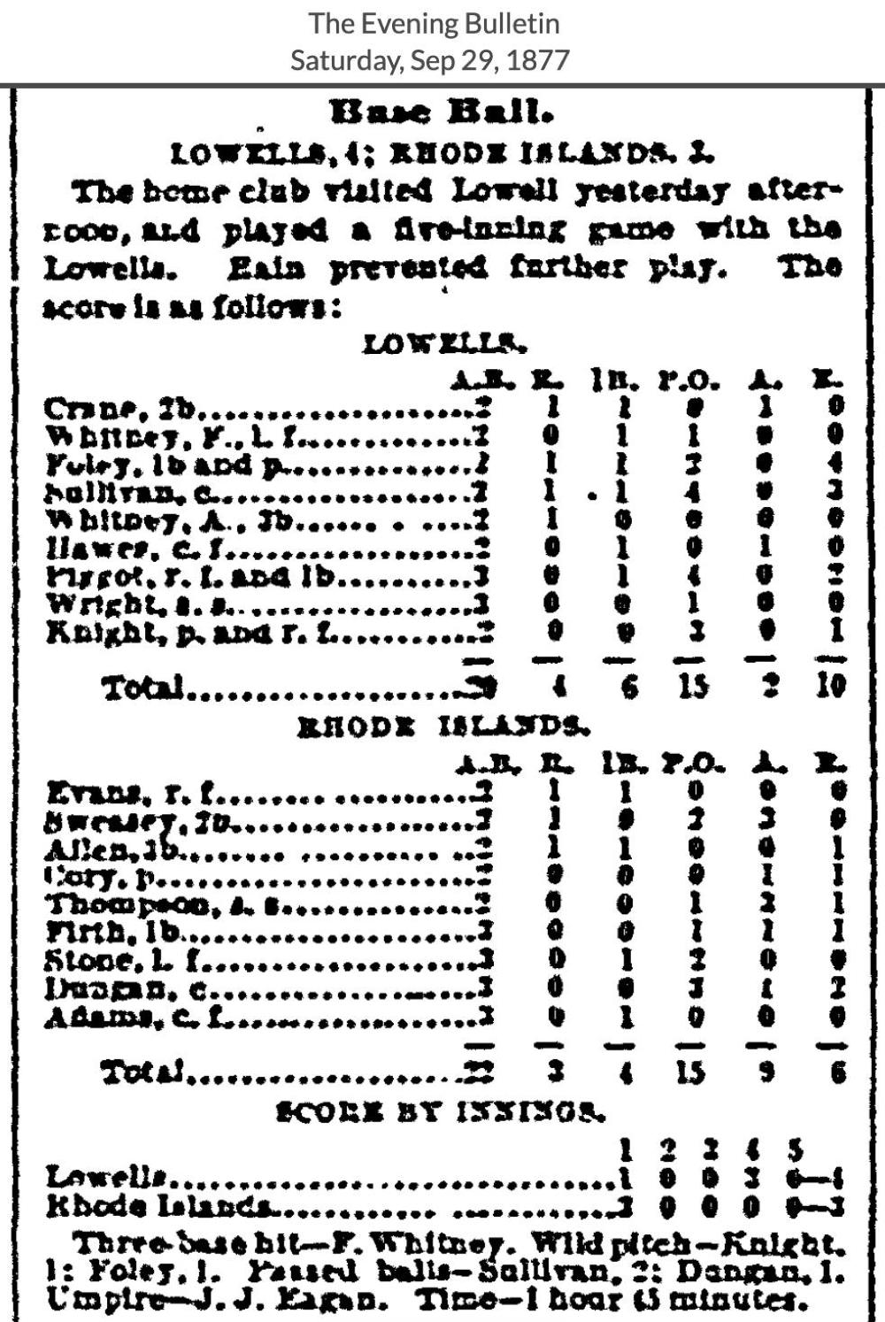 | 2b | Sam Crane | | lf | Frank Whitney | | 1b & p | Curry Foley | | c | Denny Sullivan | | 3b | Art Whitney | | cf | Bill Hawes | | rf & 1b | John Piggott | | ss | Sam Wright | | p & rf | Lon Knight | | | Rhode Island