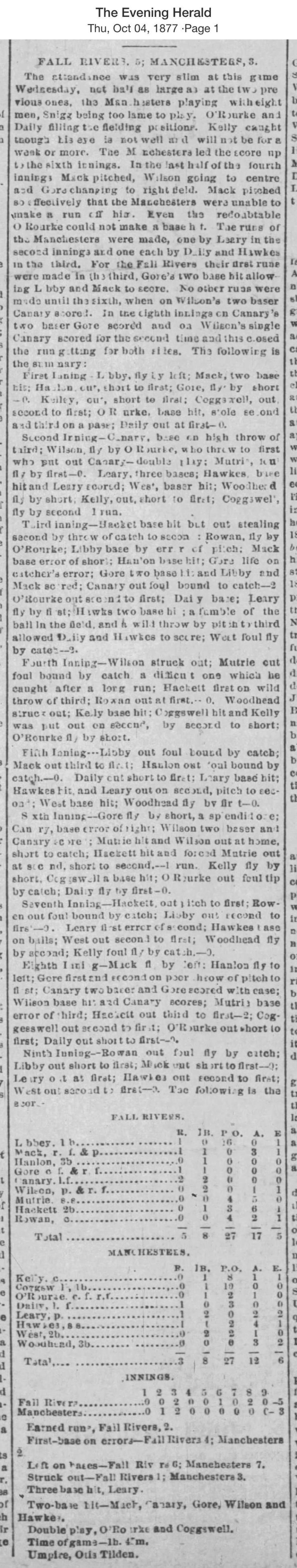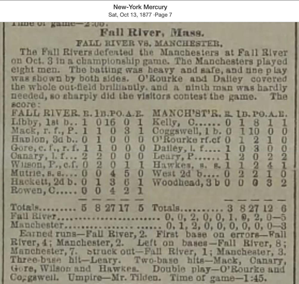 October 3, 1877 at Fall RiverFall River 5, Manchester 3GameID g10031877-01 Only eight men for Manchester