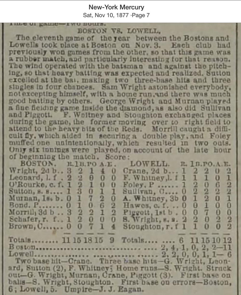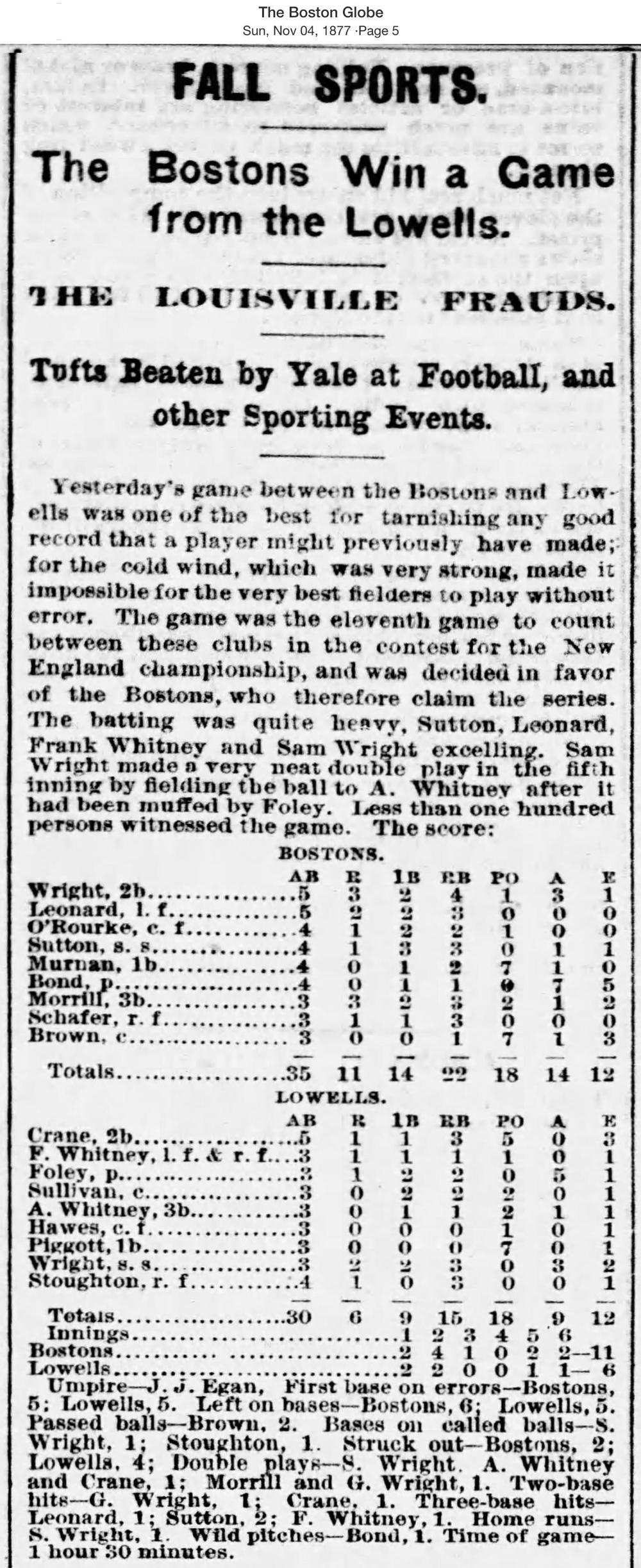 November 3, 1877 at BostonBoston 11, Lowell 6GameID g11031877-01
