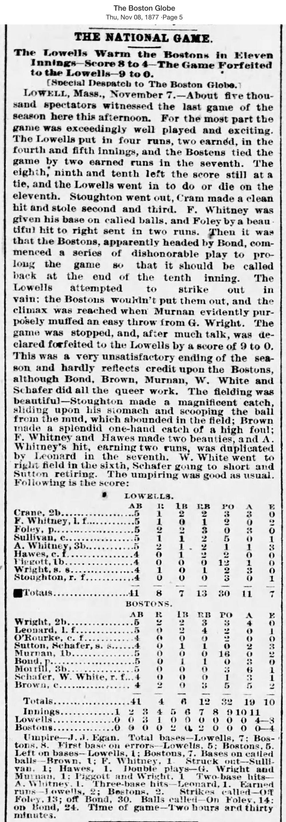 November 7, 1877 at LowellLowell 9, Boston 4GameID g11071877-01 | Lowell 2b Sam Crane lf Frank Whitney p Curry Foley c Denny Sullivan 3b Art Whitney cf Bill Hawes 1b John Piggott ss Sam Wright rf Eugene Stoughton |