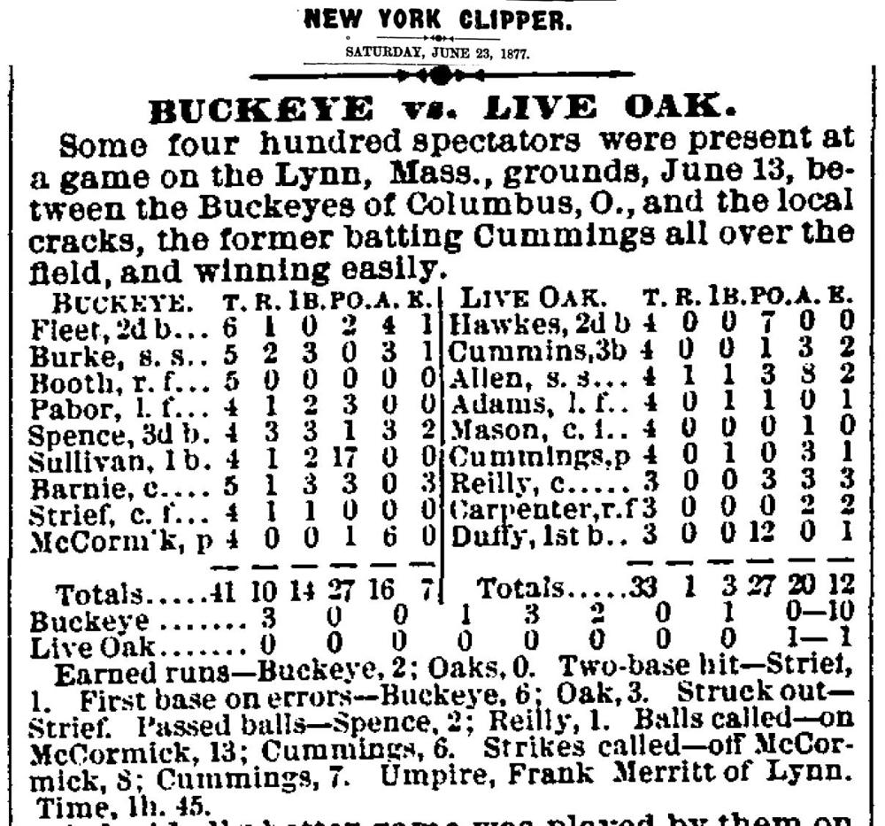 | 2b | Thorny Hawkes | | 3b | Andy Cummins | | ss | Jack Allen | | lf | George Adams | | cf | Charlie Mason | | p | Candy Cummings | | c | Charlie Reilley | | rf | Albert Carpenter | | 1b | John Duffy | | | Buckeyes