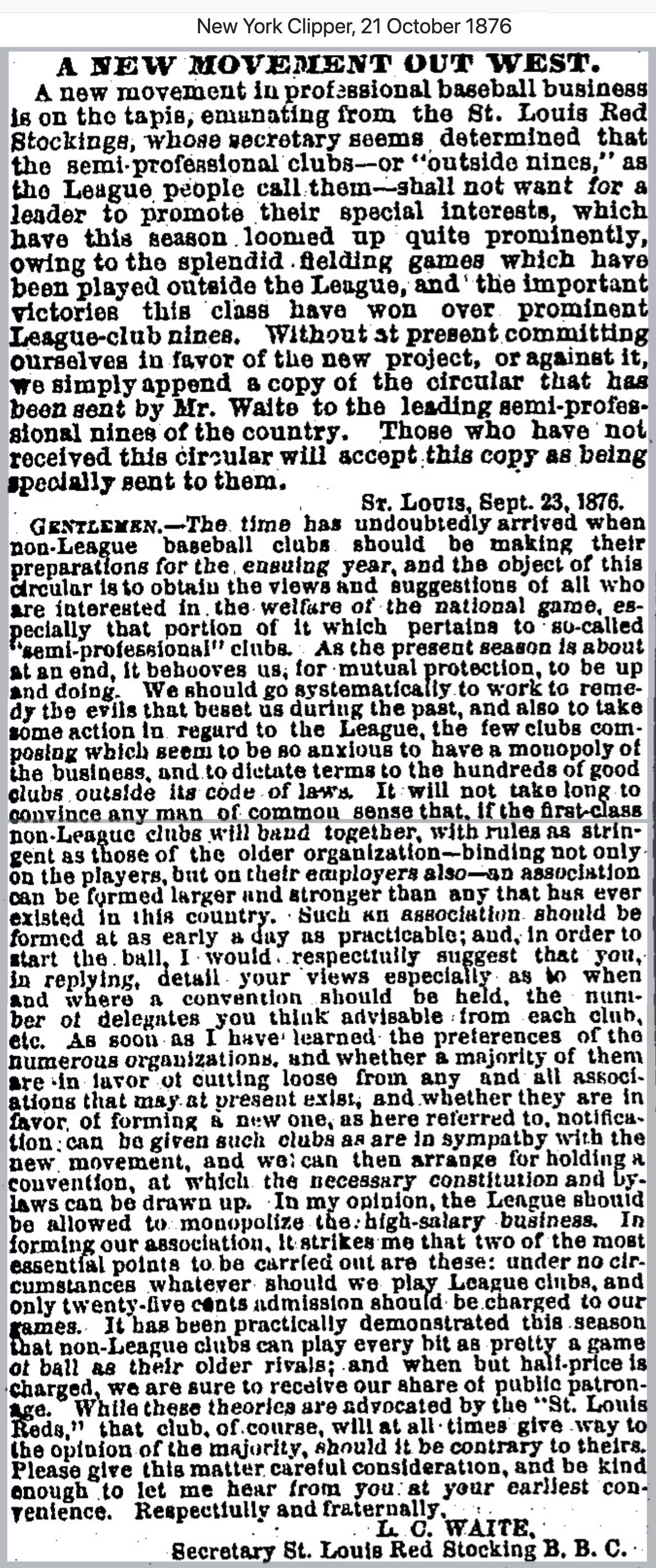 (1) "What the Semi-Professional Clubs Intend Doing Next Season," St. Louis Globe-Democrat, October 20, 1876, pg. 3. The Democrat printed Waite's letter, dated September 23, 1876.